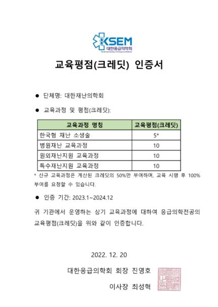 귀 기관에서 운영하는 상기 교육과정에 대하여 응급의학전공의 교육평점(크레딧)을 위와 같이 인증합니다.